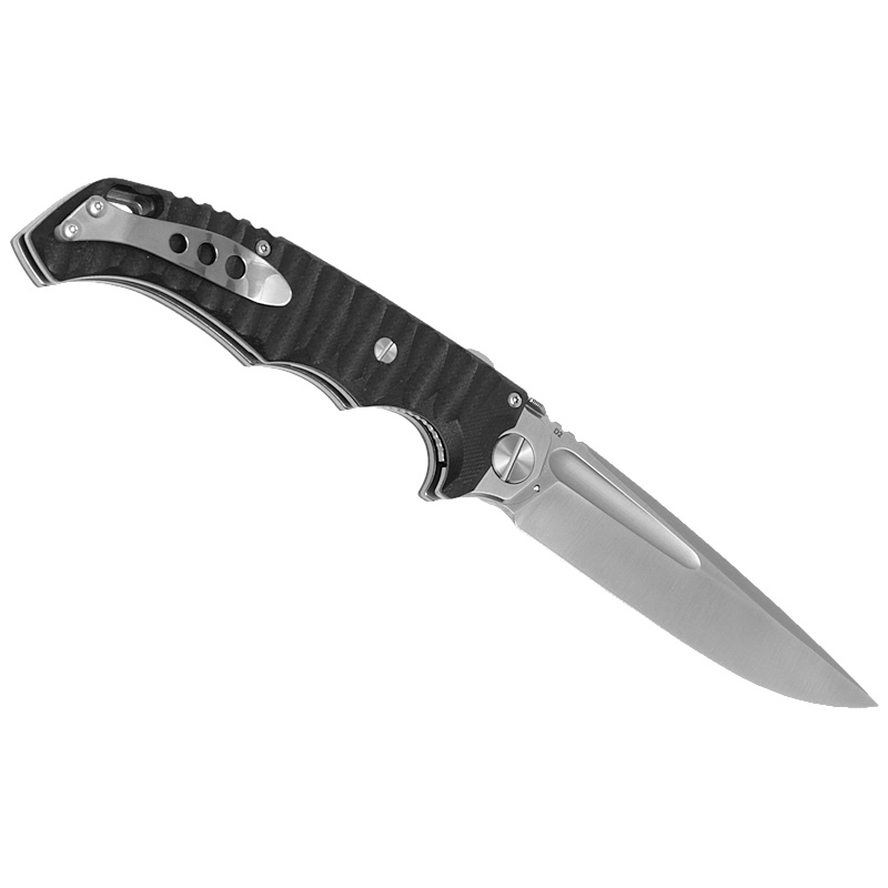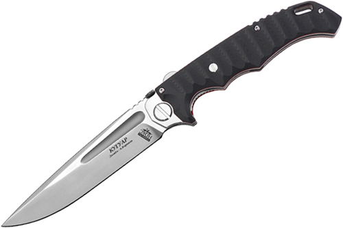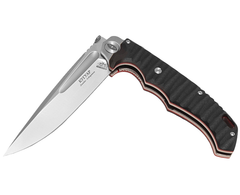 Удобная рукоять с накладками из высокопрочного пластика G10 черного цвета и изящными красными вставками прекрасно смотрится на фоне стального клинка. Трехмерный рельеф поверхности обеспечивают надежный и комфортный хват и цепкое удержание в мокрой руке. Надежный замок гарантирует безопасность работы.