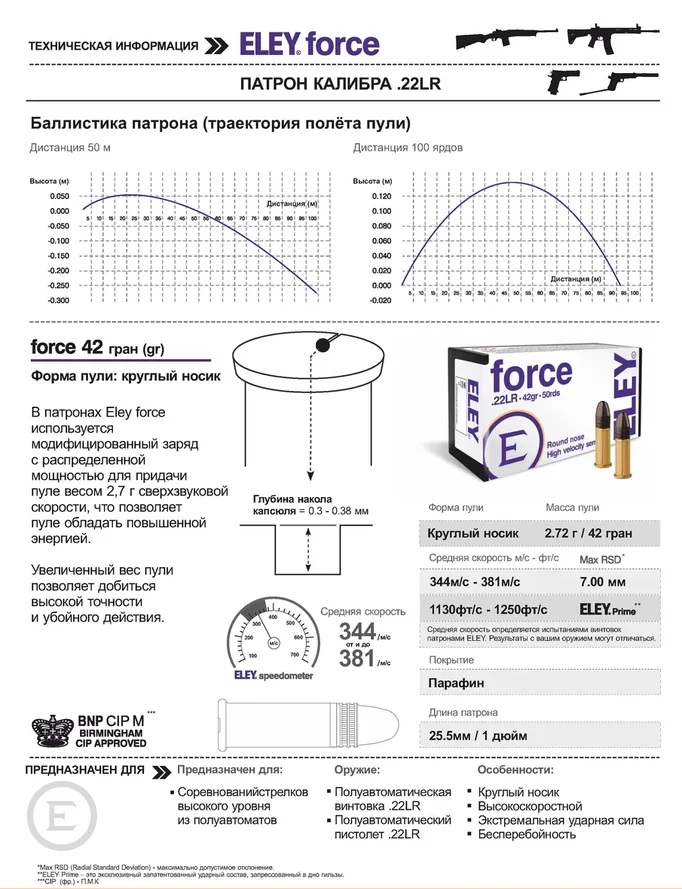 50 м (55 ярдов): 336 м/с (1103 фута/с)