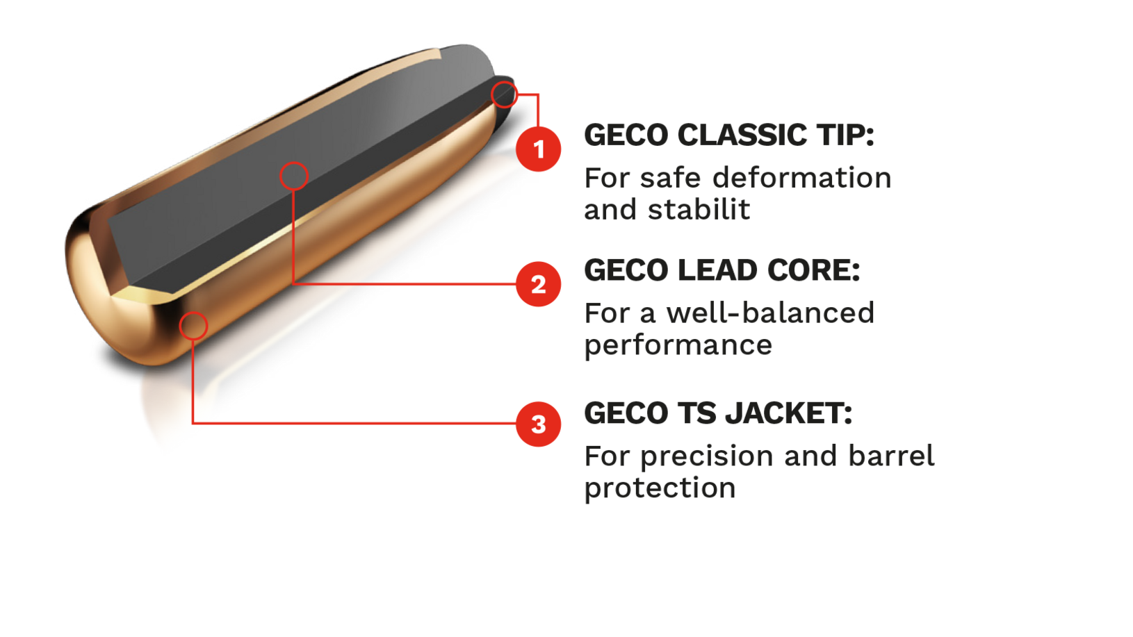 Секрет сбалансированных останавливающих характеристик кроется в свинцовом сердечнике GECO, а оболочка GECO TS обеспечивает ту точность, что позволяет раскрыть весь охотничий потенциал этой пули.