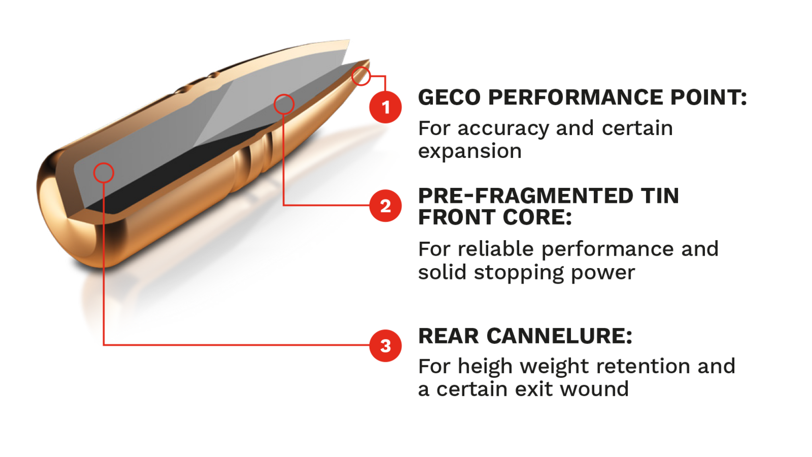В сердце GECO ZERO – революционная конструкция с двумя оловянными сердечниками, заключенными в прочную оболочку. Передний сердечник, словно цветок, раскрывается благодаря радиальному расположению заданных точек разрыва, обеспечивая молниеносную реакцию при попадании и сокрушительную мгновенную эффективность. Задний сердечник, усиленный задней перетяжкой, гарантирует стабильность в теле дичи и надежное выходное отверстие, оставляя минимум шансов на уход подранка.