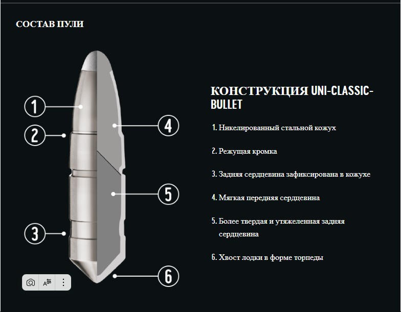 Пуля UNI Classic была разработана специально для охоты на крупную копытную дичь — аналог ID Classic. Более твёрдый и тяжёлый задний сердечник меньше деформируется, что ещё больше увеличивает пробивную способность. Как и ID Classic, передняя часть пули надёжно фрагментируется, что обеспечивает большую поражающую силу при ударе. Хвостовая часть в форме торпеды обеспечивает устойчивость в полёте.